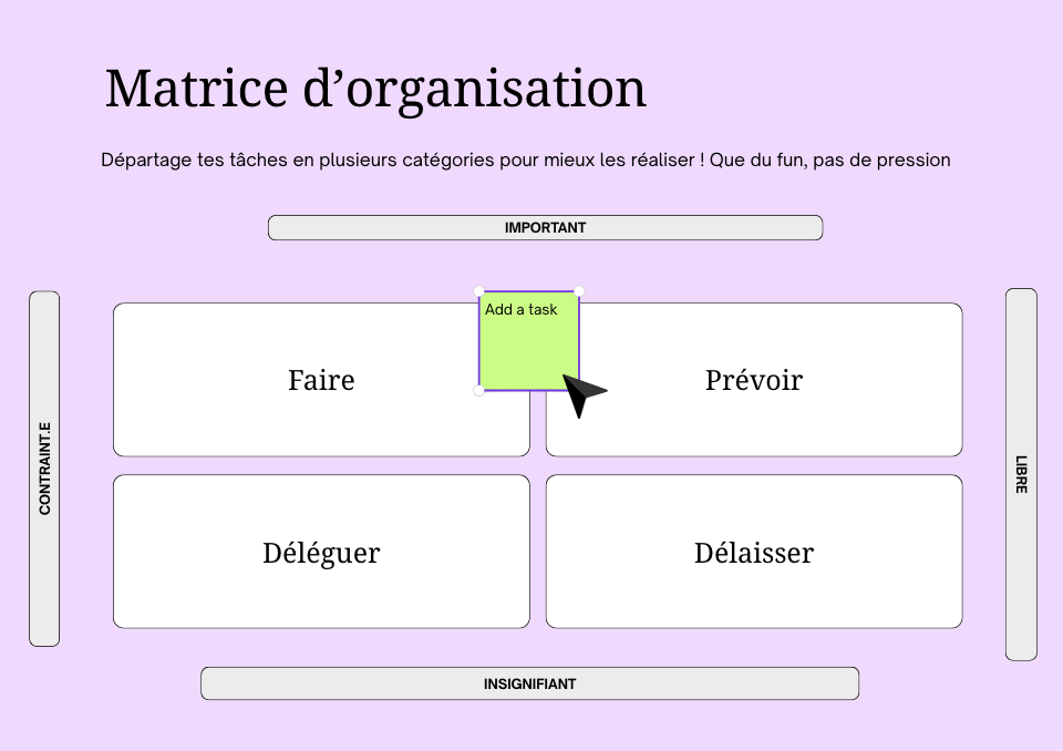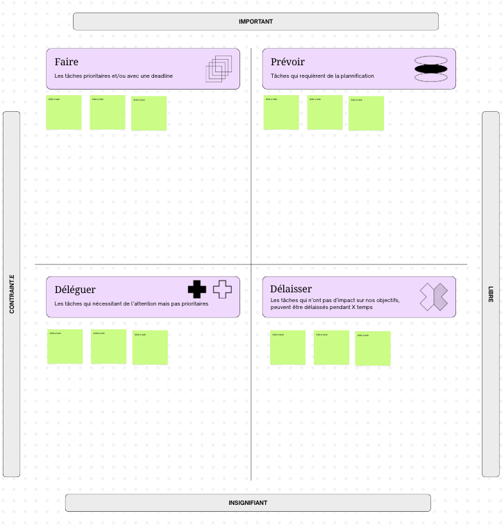 Pour t’aider à prendre l’habitude d’utiliser et suivre la matrice tu peux instaurer un code couleur à chaque catégories, faire ça suit un principe de double encodage (=double ancrage dans ton esprit, par écrit (eg. motricité + visuellement).